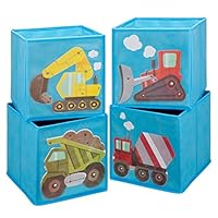 Ava & Kings Toddler Cube Storage Bins Shelf Fabric Drawers Container - Kids' Light Blue Construction Theme Toy Box Truck Organizer for Boys Girls - Fits 11x11 to 13x13 Cubical Shelves - Set of 4 |