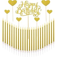 29 | 24 Count Tall Thin Metallic Gold Slow Burning Birthday Candles in Holders with Matching Elegant Classy Cake Topper for Special Custom Birthday Cake Decorations by Dream VZN by Dream VZN LLC |
