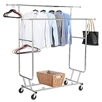 LANGRIA Heavy Duty Rolling Commercial Double Rail Clothing Garment Rack with Wheels Expandable Rods Collapsible Clothes Rack Max Load Capacity 287 lbs. for Bedroom Dressing Room Store (Chrome) |