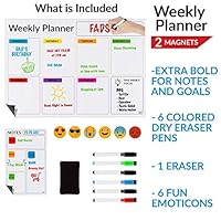80 FADS Magnetic Calendar for Fridge, Weekly Dry Erase Calendar. 17x12" Includes 6 Fine Tip Markers, 1 big Eraser, 1 extra board, 6 emoticons. Weekly Planner White Board for Refrigerator, Chore Chart.