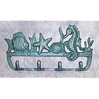 61 Cast Iron Sealife Key Hook with Seahorse Shell and Fish Green with Rustic Bronze Finish 4 Hooks Includes Matching Screws for Easy Hanging by Nauti