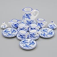 Odoria 1:12 Miniature 15PCS Blue Porcelain Tea Cup Set Blue Chintz Dollhouse Kitchen Accessories |