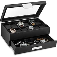 Glenor Co Watch Box with Valet Drawer for Men - 12 Slot Luxury Watch Case Display Organizer, Carbon Fiber Design - Metal Buckle for Mens Jewelry Watches, Men's Storage Boxes Holder has Large Glass Top |