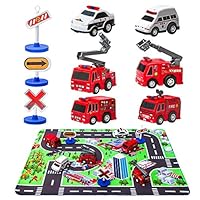6 | Fire Truck Toys with Play Mat, 6 Fire Engines, 3 Road Signs, 14" x 18" Fire Rescue Playmat, Fires Vehicle Set, Mini Pull Back Car toys by CHICKEN TOYS |